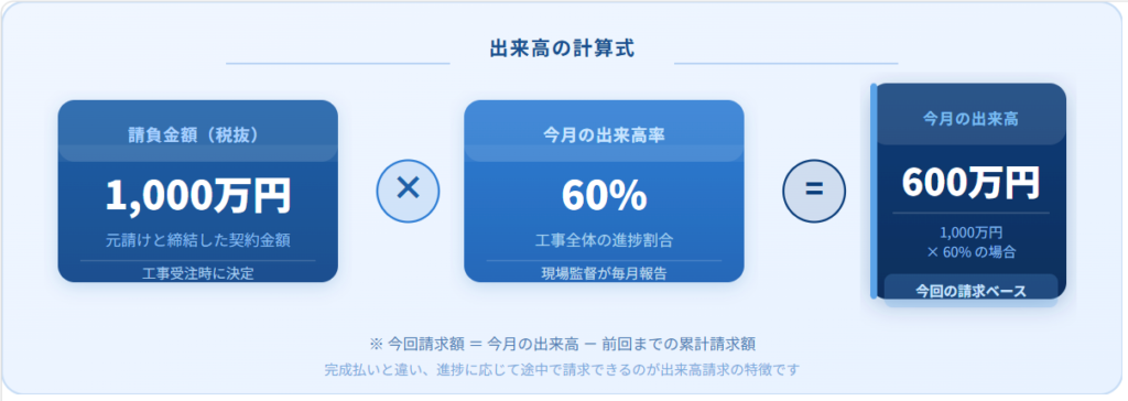累計出来高は「請負金額×出来高率」で計算し、今回請求額は「累計出来高−前回までの請求済み額」で出します。