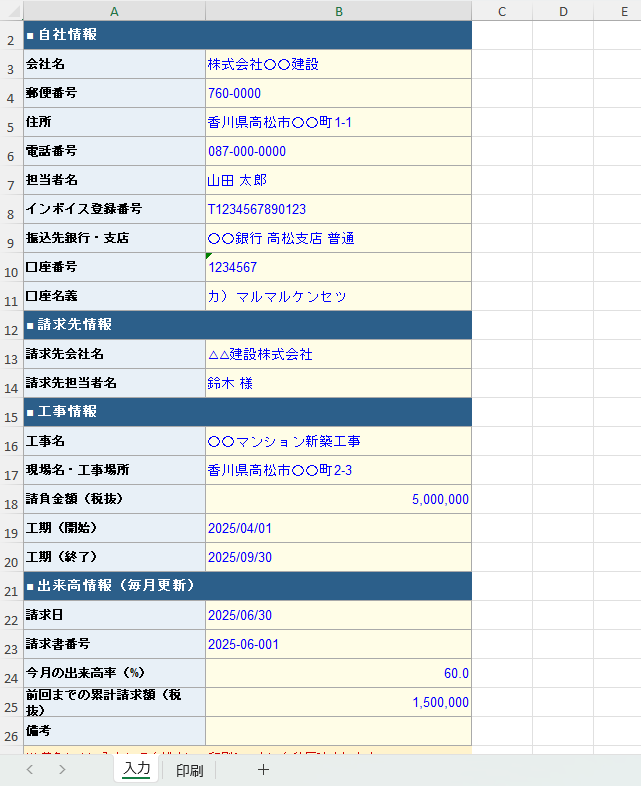 入力シートの黄色セルに自社情報・工事情報・出来高情報を入力するだけで、印刷シートに自動反映されます。