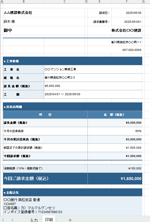普通の請求書と違うのは「累計出来高」と「今回請求額」を分けて管理する必要がある点です。