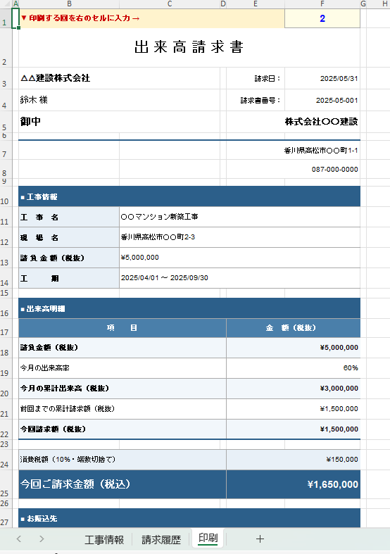 今月の出来高率と前回までの累計請求額を入れれば、今回の請求額・消費税・税込合計がすべて自動で計算されます。