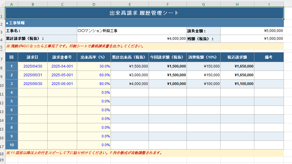 回ごとに出来高率を入力するだけで累計請求額と残額が自動更新される。残額が¥0になったら工事完了のサイン。