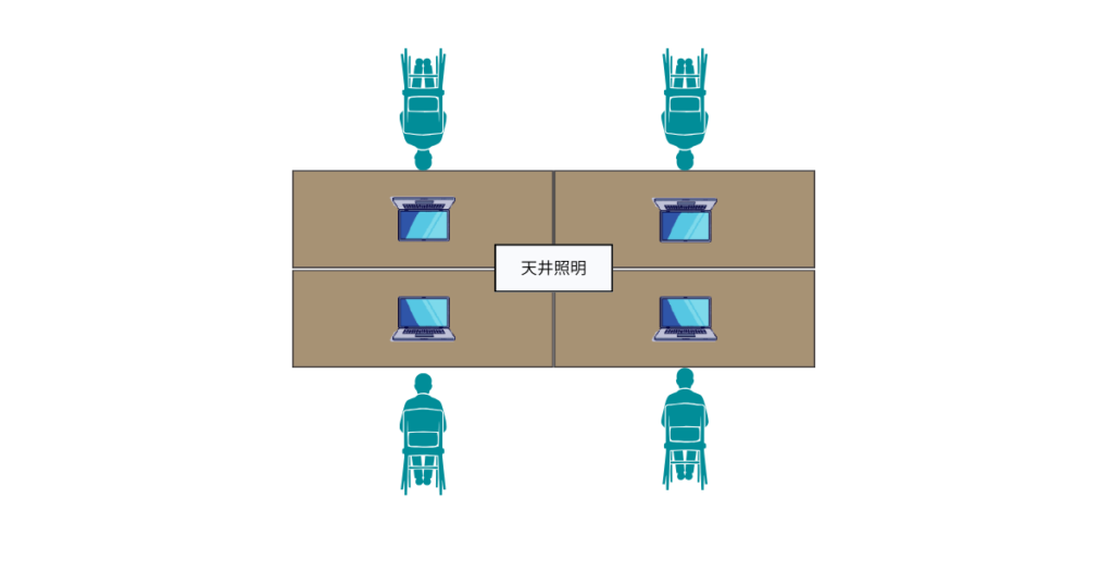 こういう配置なら天井照明からの光が手元に当たりますからね。
