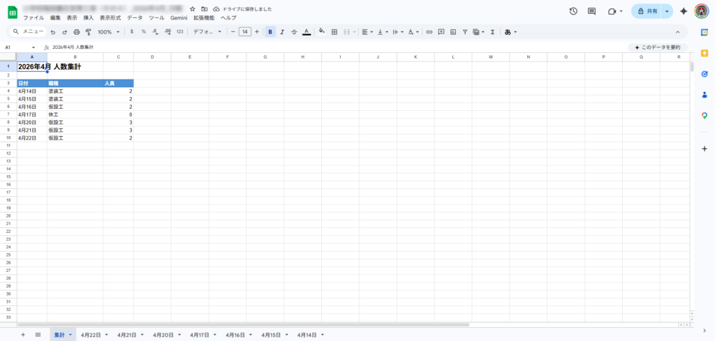 日付・職種・人員が自動で記録されていくので、月末に「今月何人工かかったか」を確認するときにそのまま使える。