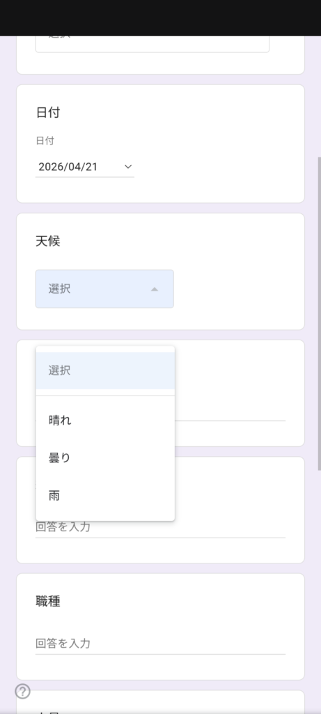 天候はプルダウンで選ぶだけなので、入力の手間もほとんどない。