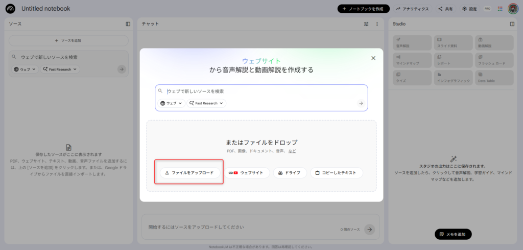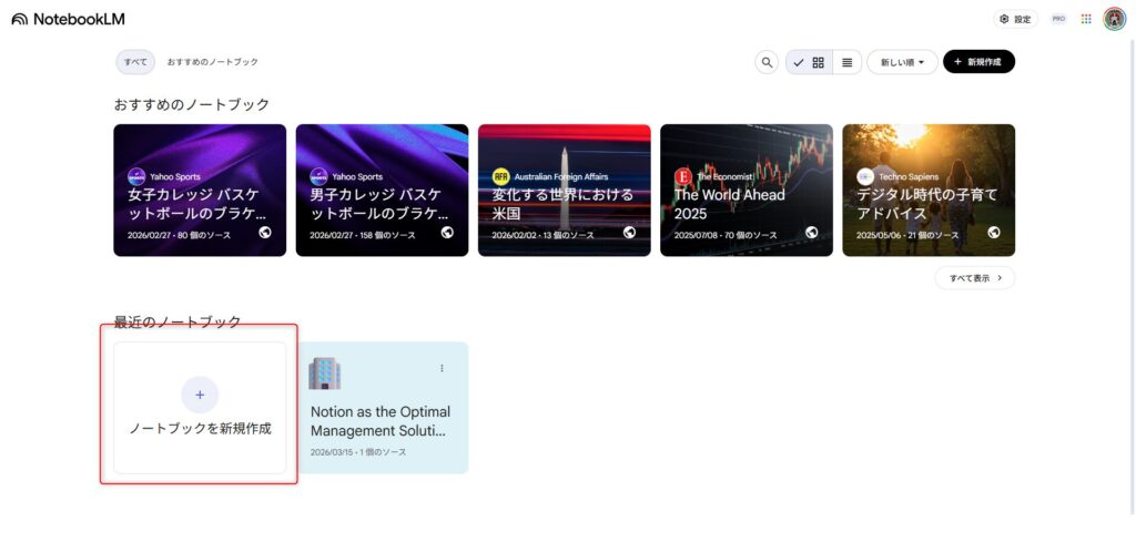 notebooklm.google.com にアクセスして「ノートブックを新規作成」をクリック。