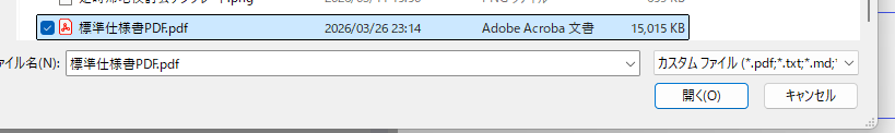 ダウンロードしておいた仕様書PDFを選ぶ。令和7年版は約15MBで制限内に収まりました。