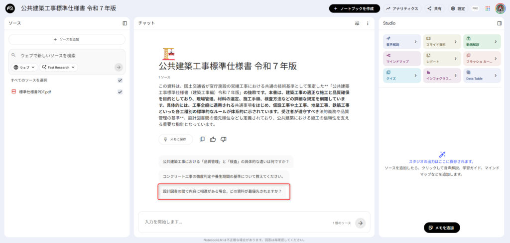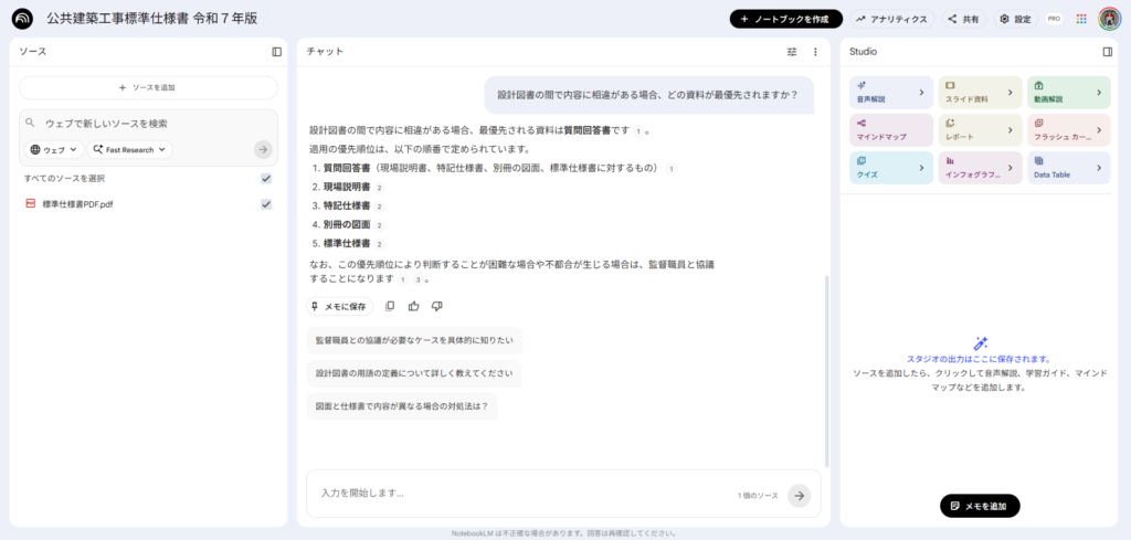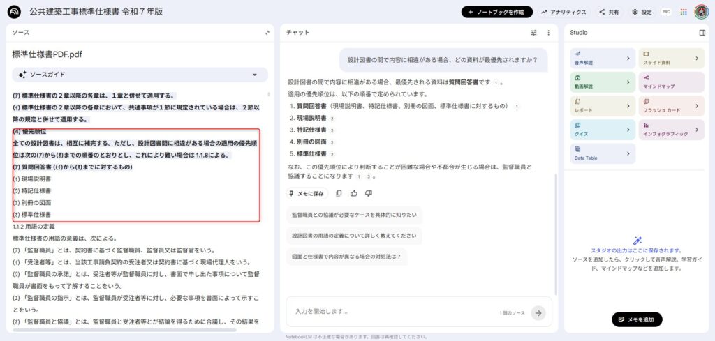 標準仕様書と特記仕様書を両方入れておけば「この工事の特記と標準で矛盾している箇所はある?」という質問もできるので手戻りも防げます。