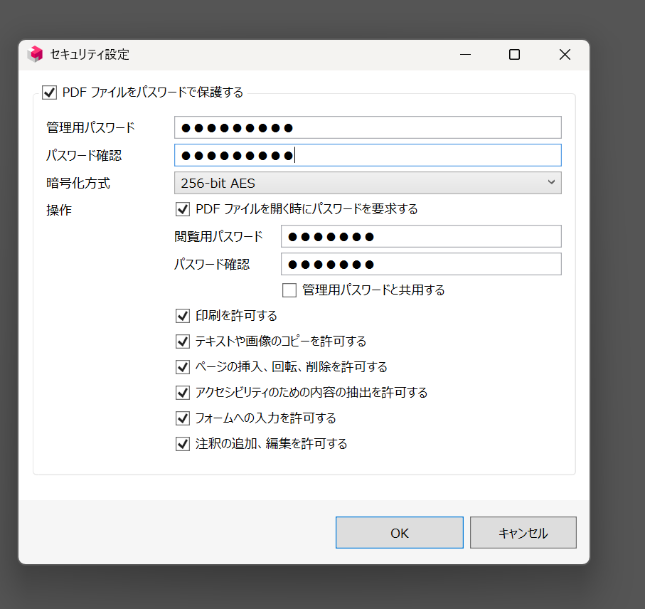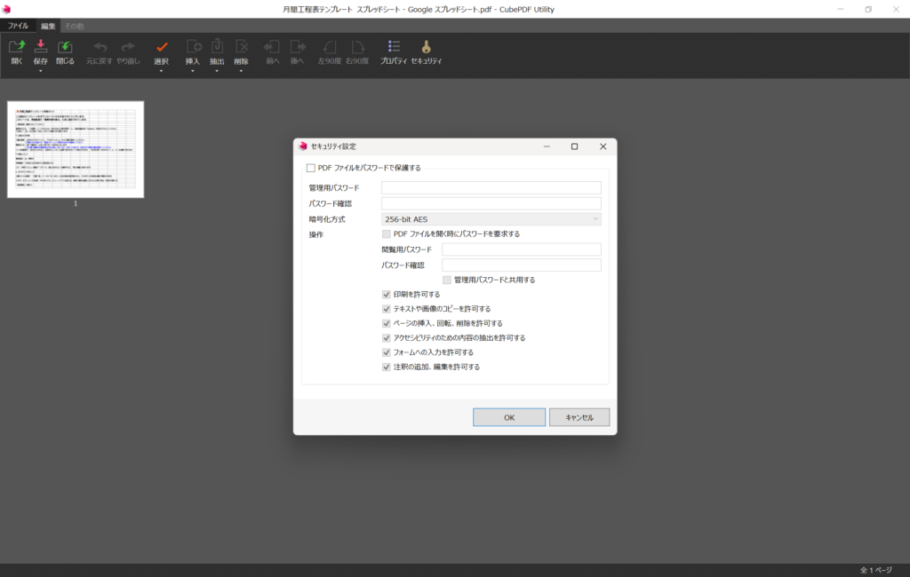 | 編集・印刷制限用パスワード | 開けても編集・印刷を制限できる |