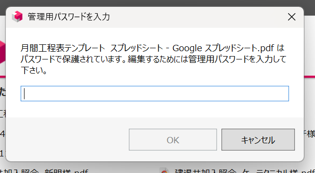 保存したPDFを開こうとすると、パスワードの入力画面が表示されます。これで設定完了です。